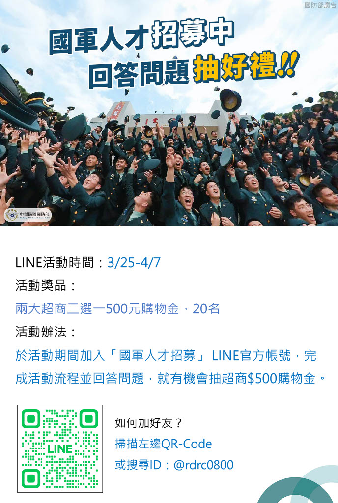 國防部「國軍人才招募LINE官方帳號」推廣 發佈日期:2024-03-28 00:00:00 一、為提供國軍招募資訊,國防部於LINE建置官方帳號,配合招募班隊期程推播報考訊息,供民眾及青年學子參考。 二、加入帳號可參加本次活動(抽獎超商500元購物金),請踴躍參加。 瀏覽人次 1057 活動海報.jpg