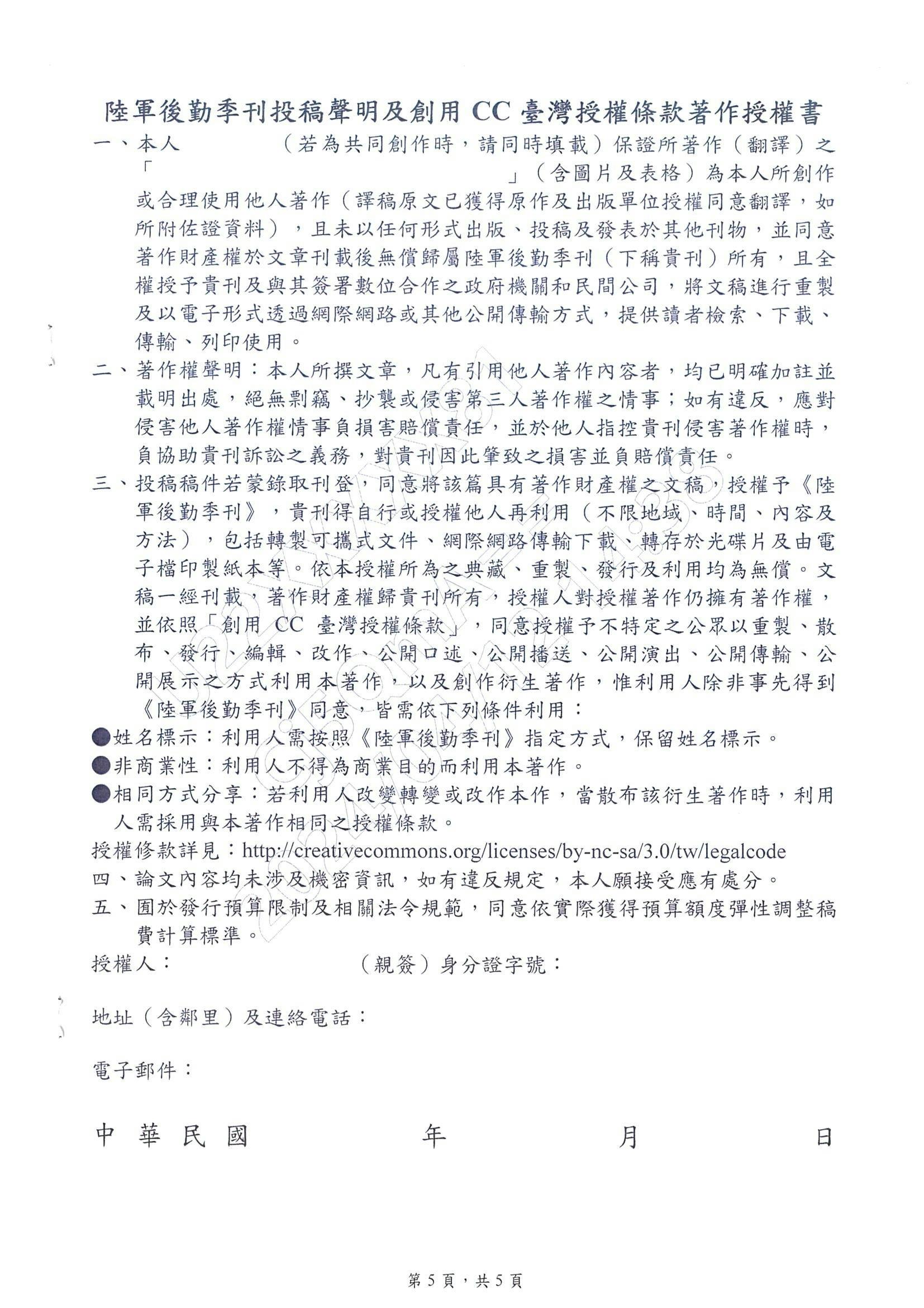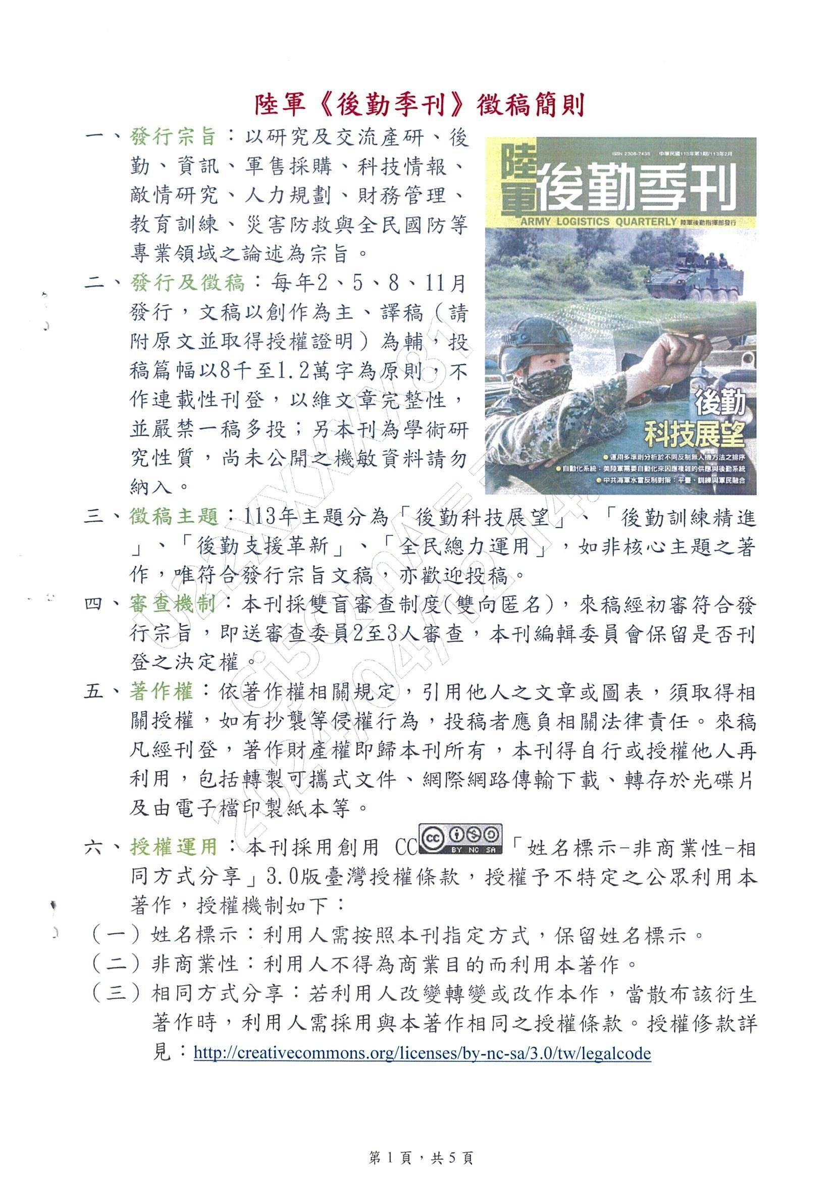 《陸軍後勤季刊》以研究及交流產研、後勤、資訊、軍售採購、科技情報、裝備研改、敵情研究、人力規劃、財務管理、教育訓練、災害防救及全民國防等專業領域之論述為宗旨。